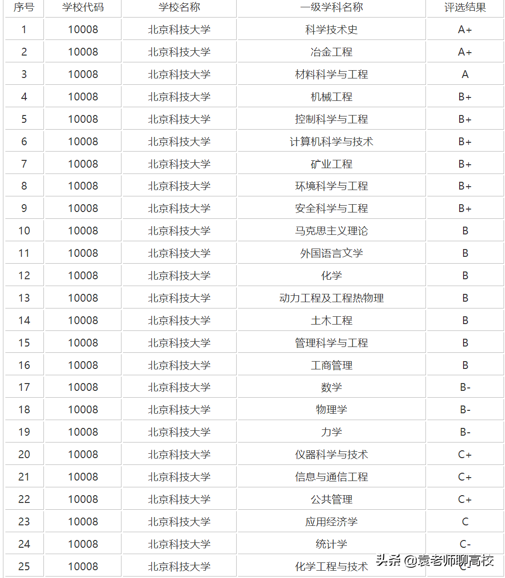 在第四轮学科评估中,北京科技大学科学技术史、冶金工程这两个学科被评为A+,材料科学与工程被评为A,具体可见下图!