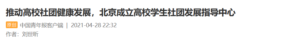 4月,《中国青年报》报道了北京高校学生社团发展指导中心在北京联合大学成立。该中心由团北京市委和北京市委教育工委主办,北京联合大学承办,旨在加强对北京高校学生社团工作指导,更好发挥高校学生社团育人功能,推动高校学生社团健康发展。