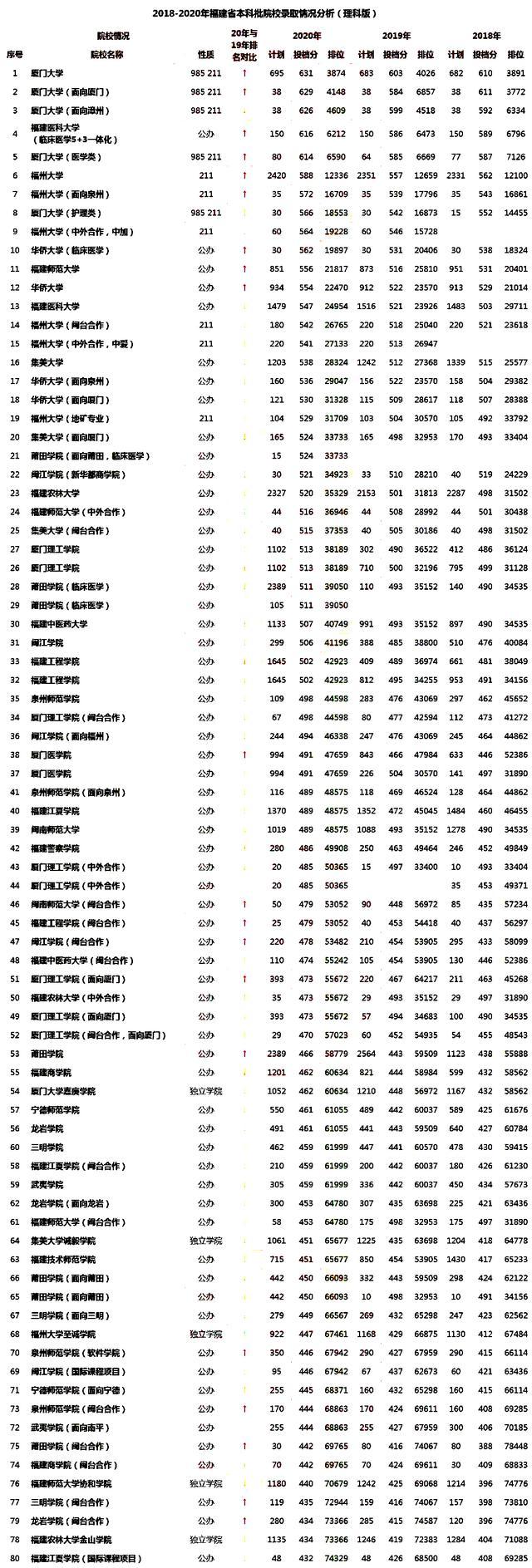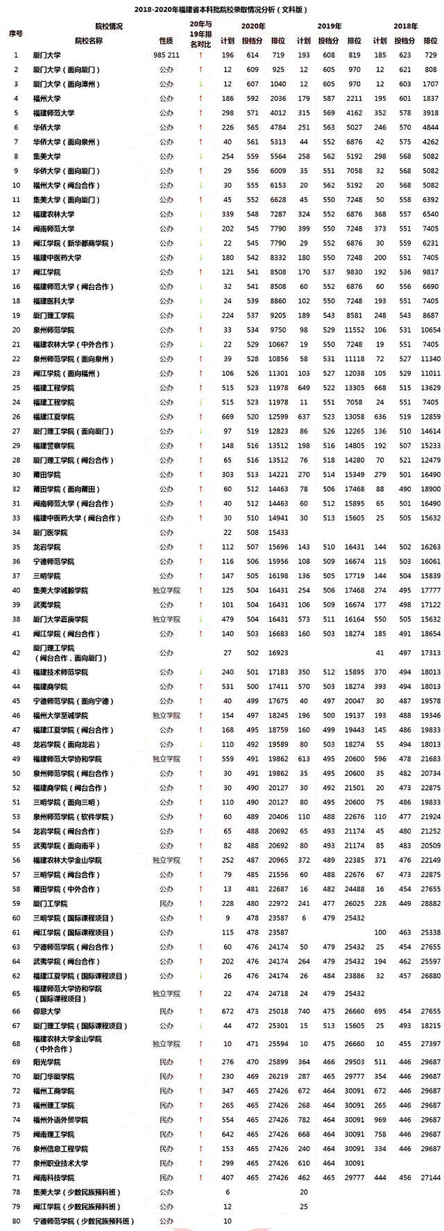 985/211高校:厦门大学(985),福州大学(211);省重点建设高水平大学:福州大学、福建师范大学、福建农林大学、华侨大学;省部共建高校:厦门大学、福州大学、华侨大学、福建师范大学、福建农林大学;下面按照文理科分别列举了福建省内各院校近三年来(2018-2020)在省内的录取分数线情况。