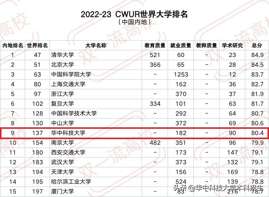 在世界大学排名中心(CWUR)2022-23世界大学排名中,位列中国内地高校第9名,世界排名第137名。