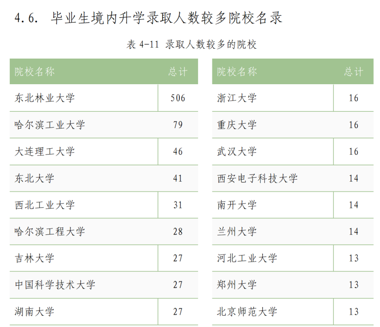 读研比例中,除了东北林业大学506名外,其他升学质量包含哈工大,浙大这样985,还算符合211的特点!