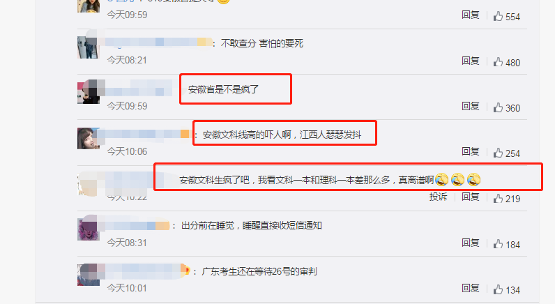 还有其他未出分数线的省市考生表示:“看过安徽省的分数线,作为文科生有些瑟瑟发抖,今年分数线这么高吗?心疼安徽文科生一秒钟。”
