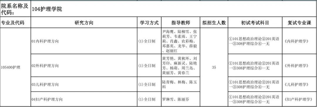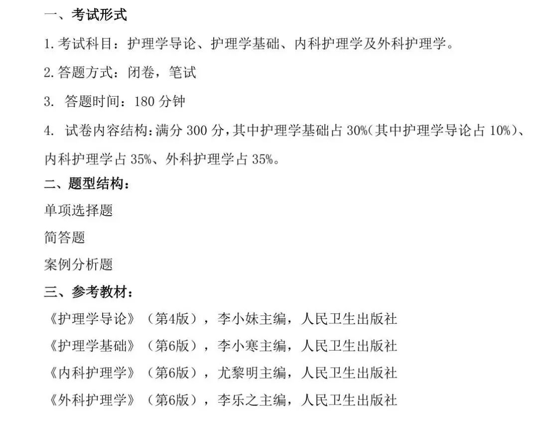 复试科目:01方向,内科护理学;02方向,外科护理学;03方向,儿科护理学;04方向妇,产科护理学