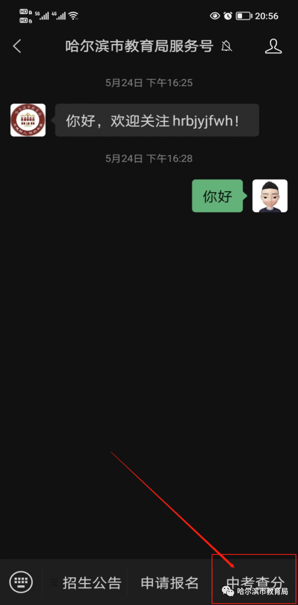 方式二:通过哈尔滨市教育局服务号微信公众号查询。