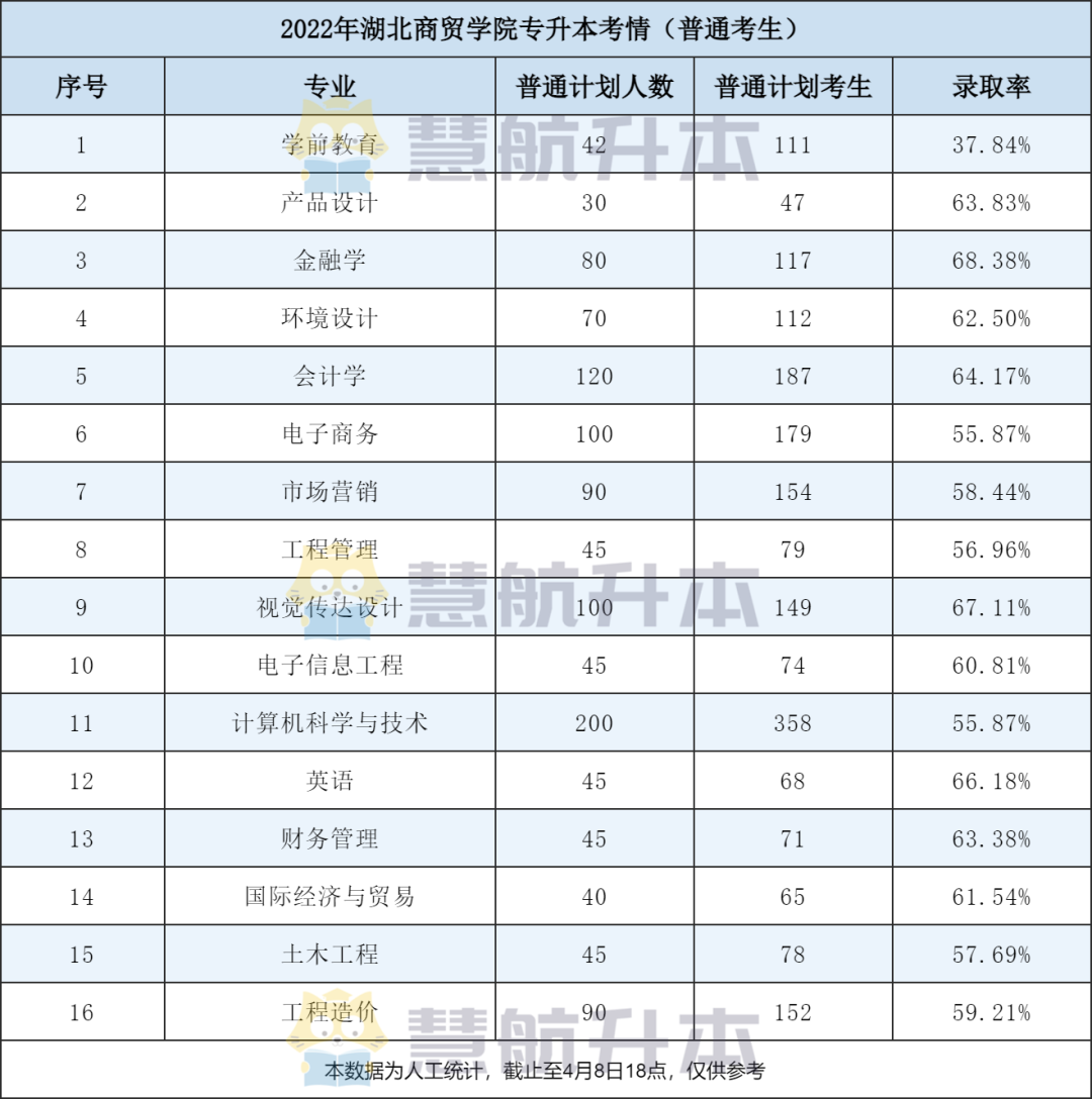 相比其他可以跨考的院校,湖北商贸学院的录取率也挺不错,2022年共有16个专业招生, 综合录取率为59.32%。
