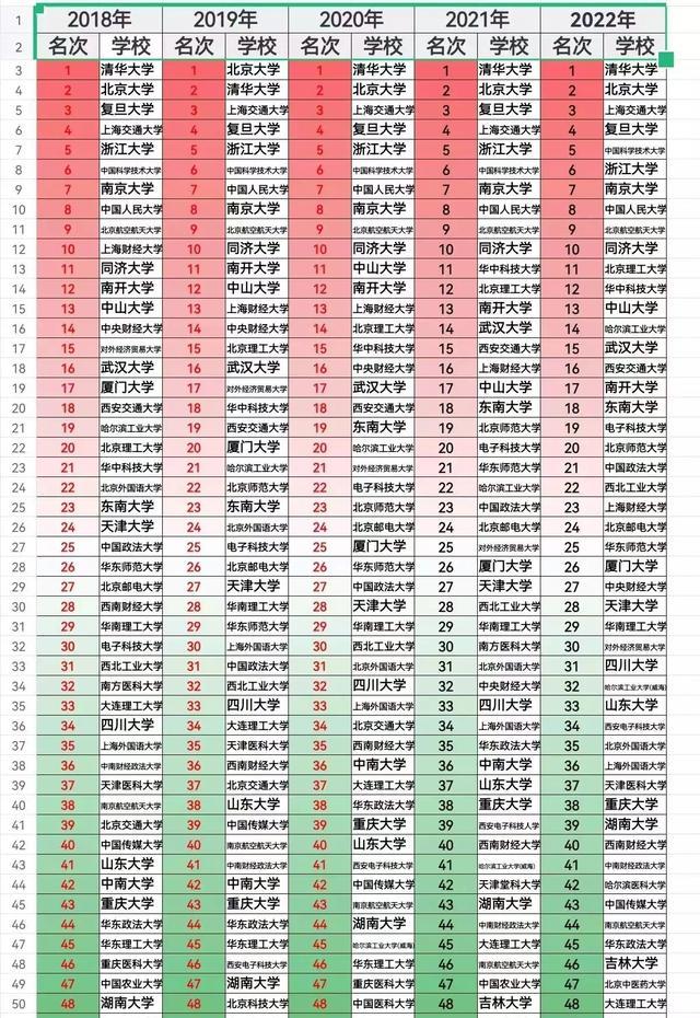 高校的录取分数线,有时候可以作为高考志愿填报的参考,近日,有人(也有可能是机构)在网上发布了一个2018年到2022年全国高校录取分数排名TOP50,我们看一下。