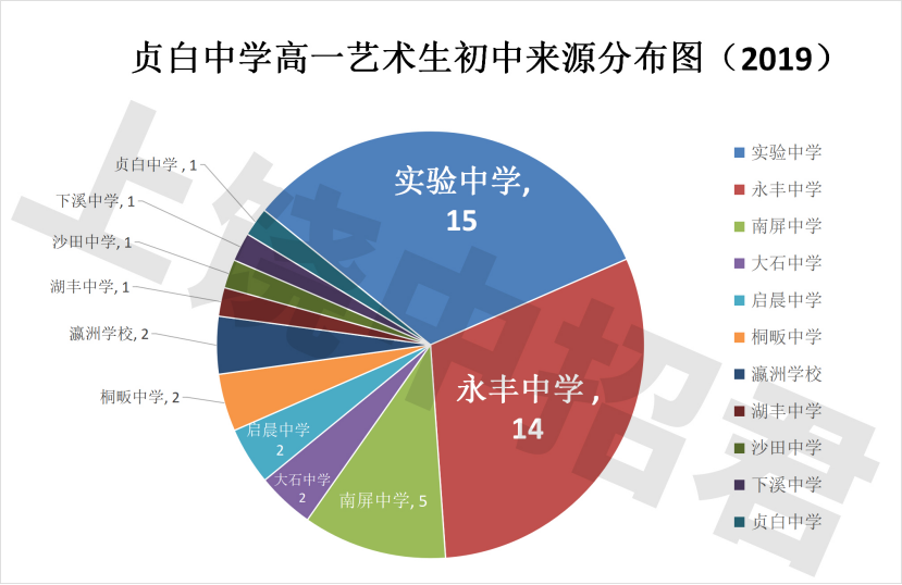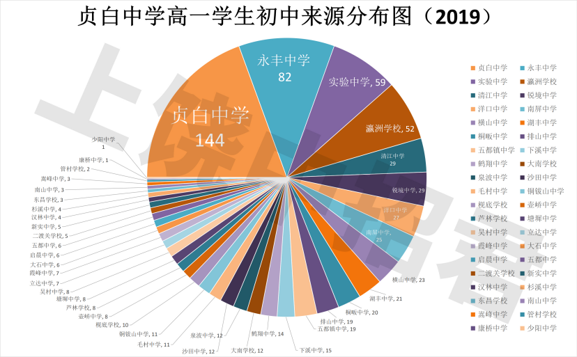 又上图可知,贞白中学今年市内共招生741名,来自于本校的初中部的生源在高中录取中占了蛮大比例的。永丰中学其次。
