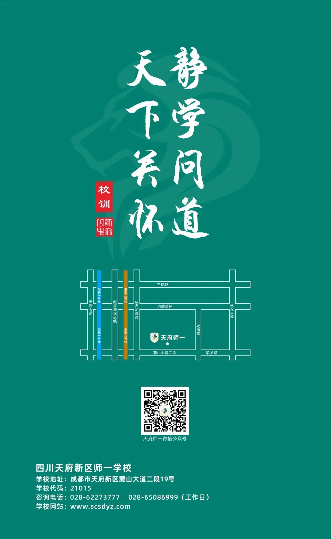 天府有材,于斯为盛。天府师一坐落在四川天府新区麓山怀抱,这里环境幽美、空气清新、鸟语花香,远离城市喧嚣,独得一份安然。森林公园式的校园与天府师一校训“静学问道”相得益彰,为老师潜心育人,为学生静心学习创造一个理想空间。学生昂扬向上,充满阳光;老师锐意进取,富有爱心。师生各美其美,美美与共。