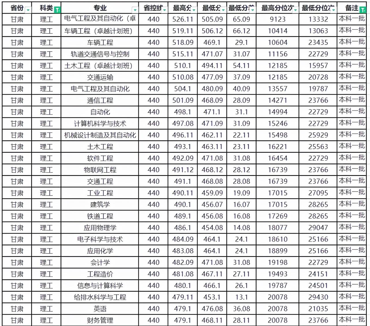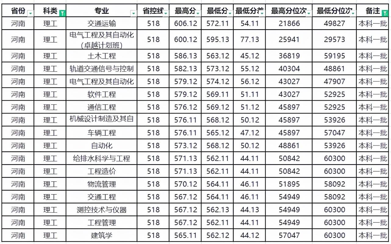 兰州交通大学在河南省本科一批和本科二批都有招生,其中有17个专业在本科一批招生,录取最低分为562分,高出本科一批省控线44分;在本科二批有12个专业在招生,录取最低分为514分,高出了本科二批省控线114分。而在本科二批录取的各专业中,绝大多数专业录取最低分都高于了河南省本科一省控线,像电子信息工程专业,其录取最低分为546分,高出了河南省本科一批省控线28分。