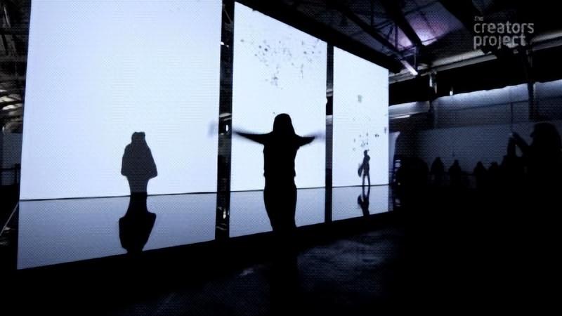 Exile工作室创作出了一个感知视觉及情感体验的交互式装置“ Ego”,作品是基于一个粒子系统的运动来感应人们实时的动作行为,人们的动作通过投影转换成条形状在面前。