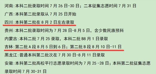各省份录取时间不同,有的省份还没开始招录二本。从公布的时间上看,各省份招录有前后之分。像四川、吉林、新疆等都是8月开录,所以这些省份的考生不用着急,录取工作还没开始,怎么能有录取结果呢?