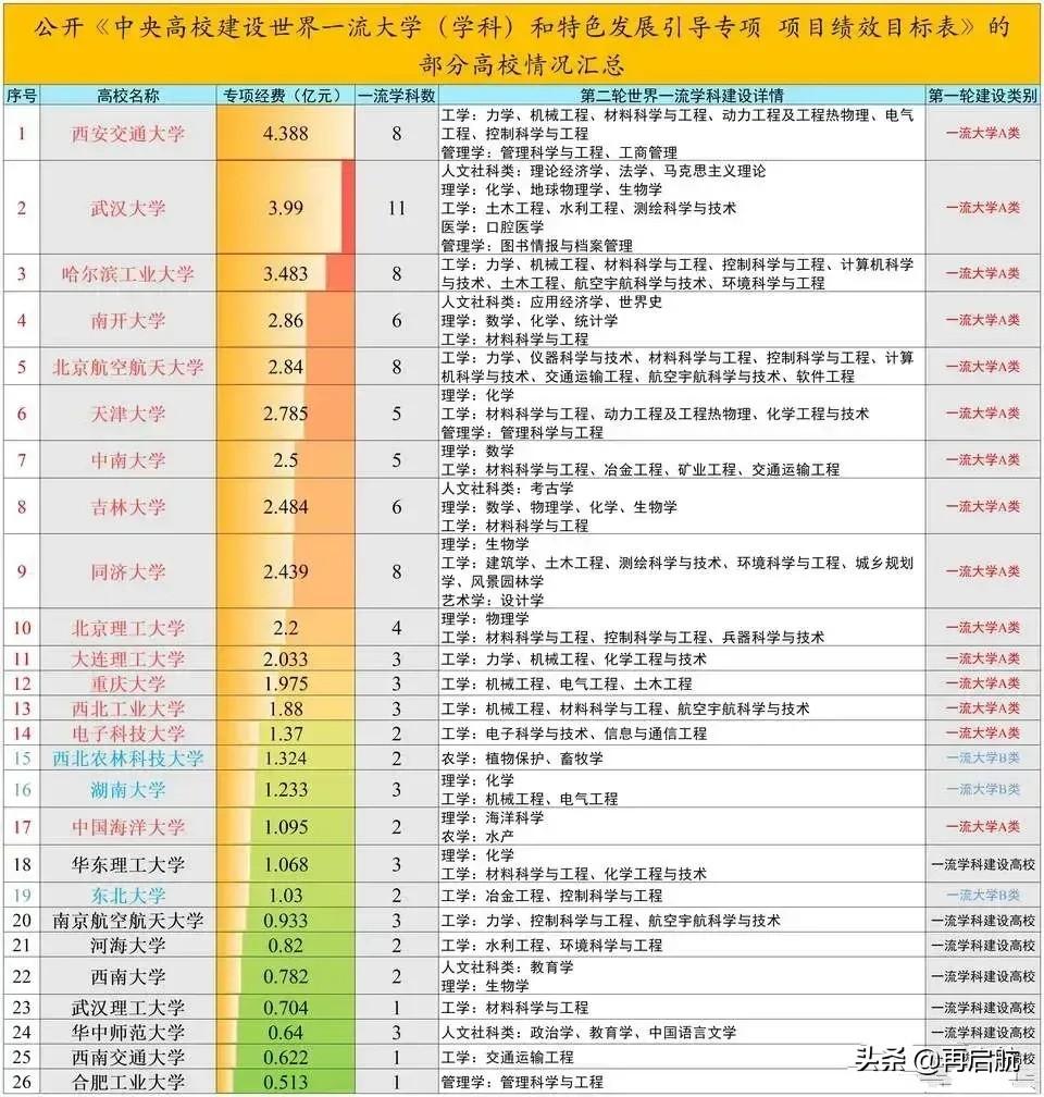1、西安交通大学作为西部第一名校,国家定位是非常高的,8个学科支持4.38亿,或武汉大学拥有11个学科的经费,仅仅3.99亿元。