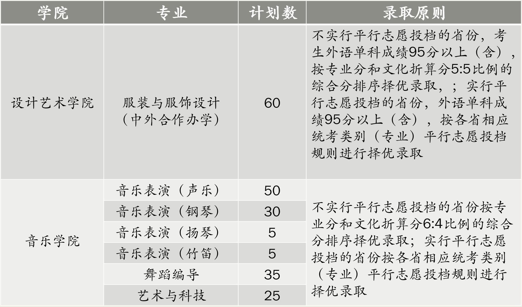 ①以上表格内专业成绩承认相应省统考成绩;②服装与服饰设计(中外合作办学)专业的合作办学方为英国考文垂大学,英方专业课程采用英语教学;学生在升入本科三年级前须达到雅思6.0分或通过考文垂大学英语能力测试,否则会被取消英方学籍。