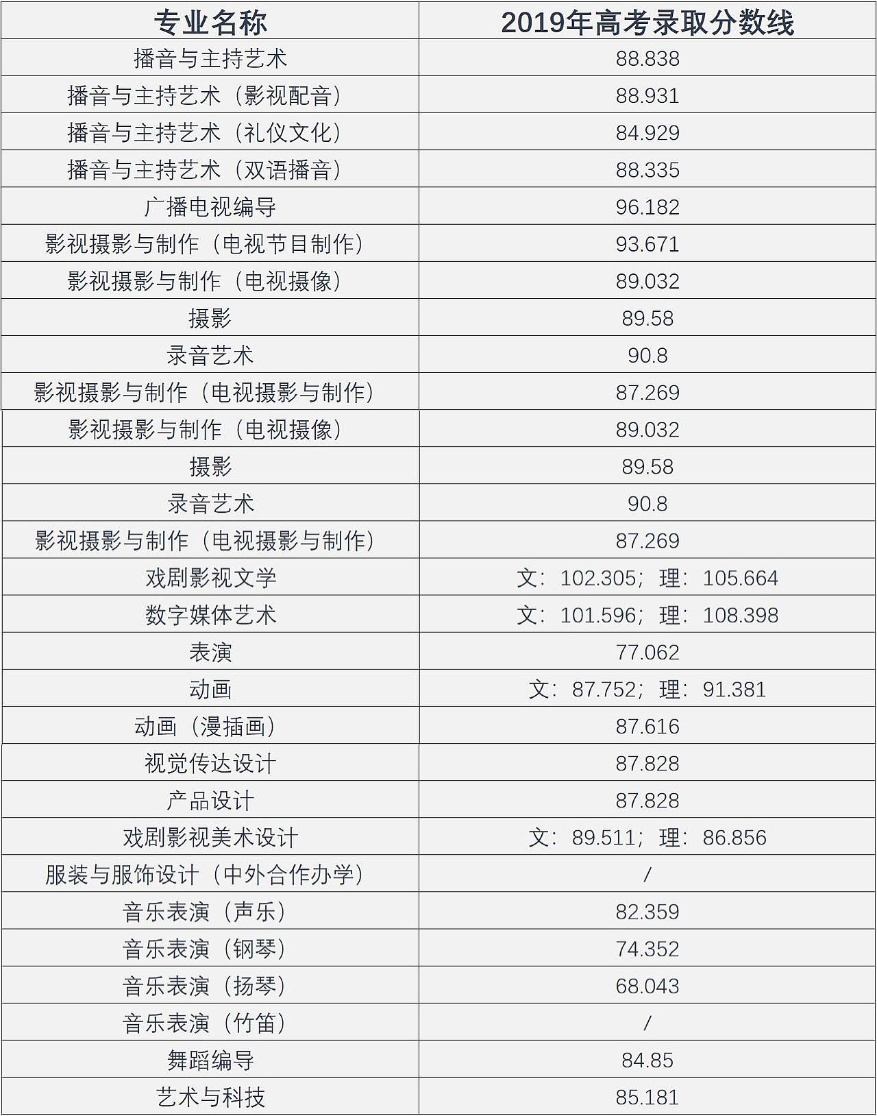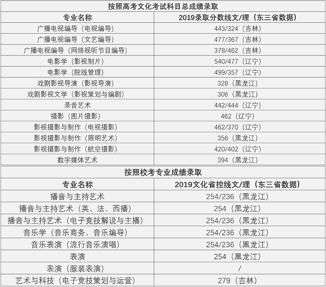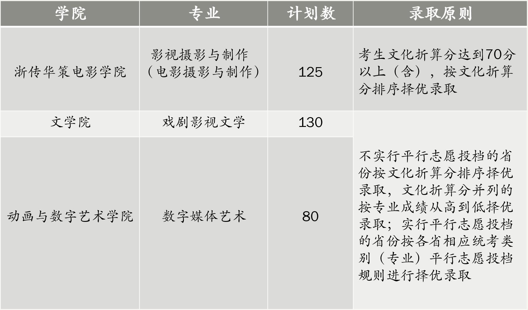 其他的专业如广播电视编导、影视摄影与制作、摄影、录音艺术等是按照文化折算分来进行录取。浙传的广播电视编导专业2019年录取分数线为96.182分,按照文化折算分=考生高考总成绩÷考生所在省普通类本科一批录取控制分数×100的公式,已知2019年辽宁省本科类录取控制分数为482分,那就意味着考生文化课成绩需要达到464分左右,才有可能会被录取。