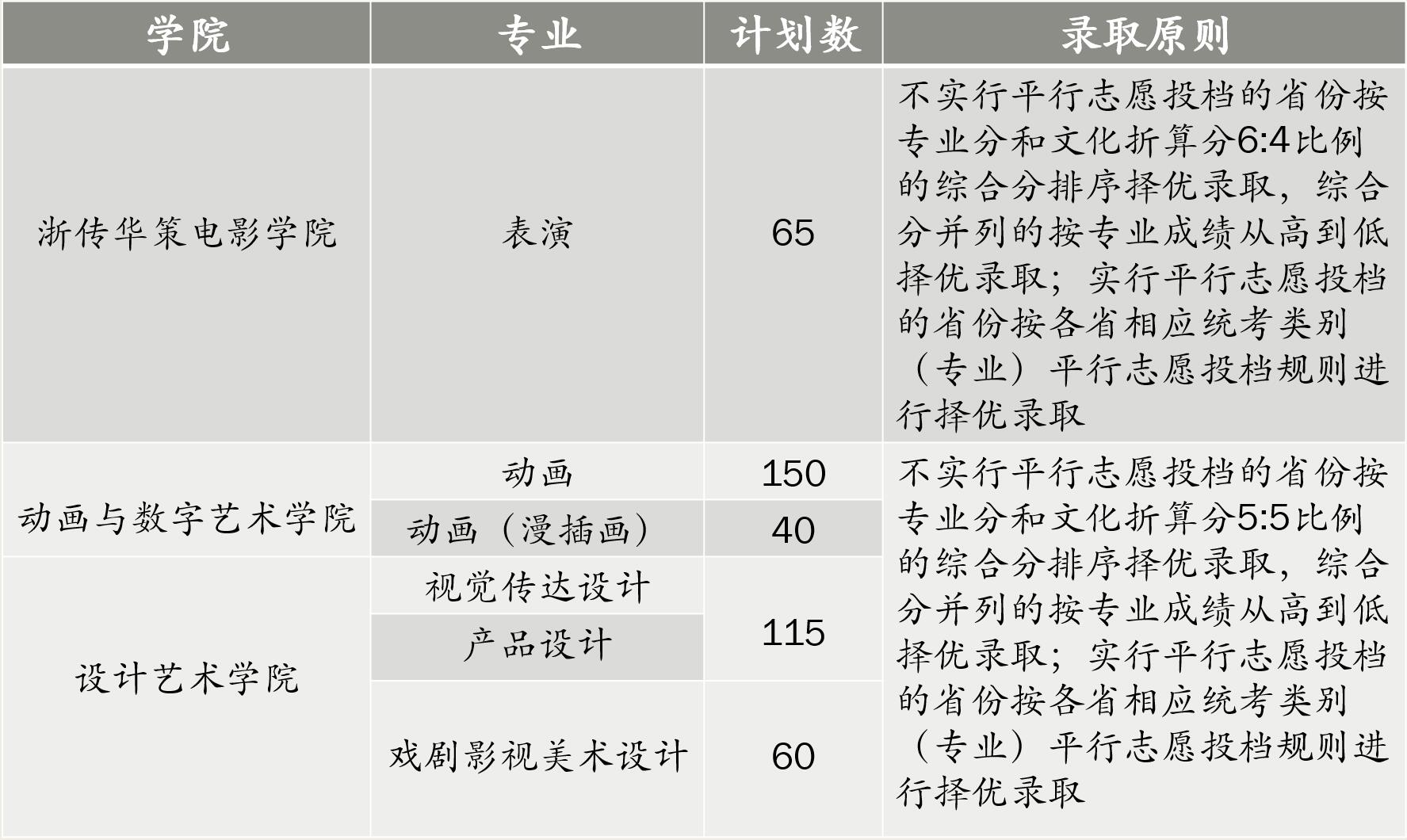 对于普通类高考按照文化课分数进行录取来说,艺术类专业的录取规则稍显复杂,比如浙江传媒学院的录取规则,就有按照文化折算分录取、按照综合分进行录取等两种录取方式。