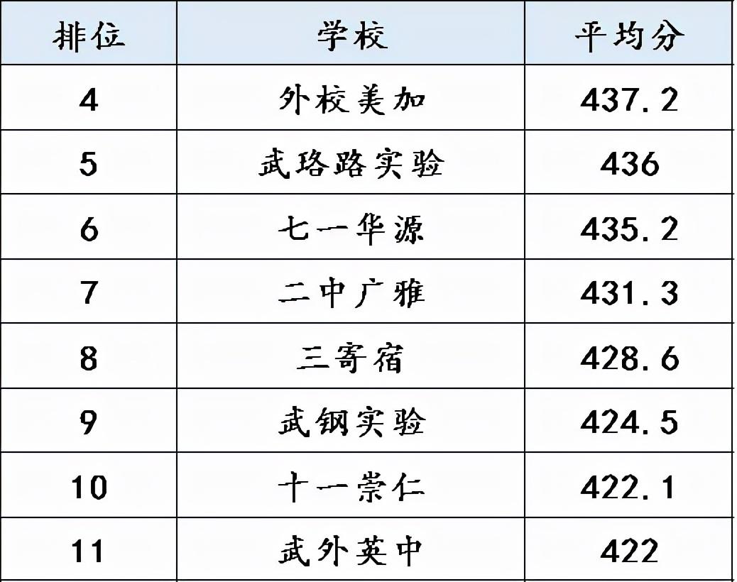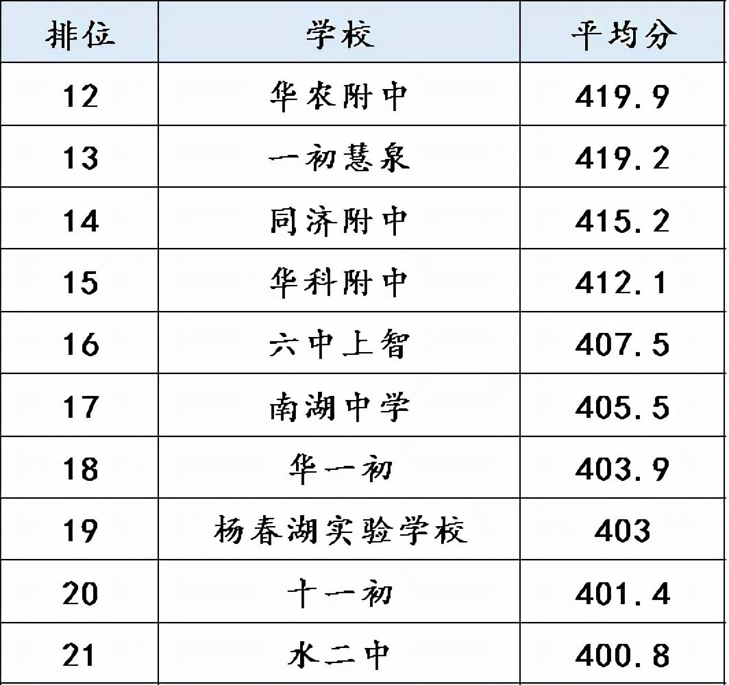 中考均分达到420分以上的学校基本为以往的老牌名初,各区公参民学校。武珞路实验和汉阳三寄都是千人大校,能够在均分上依旧保持这样的优势实属不易。