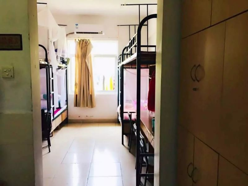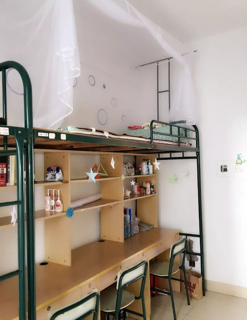 女生宿舍的课桌椅分两列摆放在一号床与六号床下铺位置,而男生宿舍的桌椅则集中排放在宿舍的中间位置,两两相并拢。