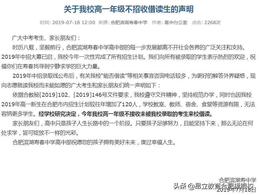 去年,合肥滨湖寿春高中部发出声明,说明学校不再接受借读生。