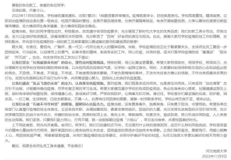 从以上这封信中,不仅对河北地质大学这次疫情有了一个整体的介绍,还从中可以看出学校作为承担疫情防控主体责任所作出的努力,特别是教工闻令而动、尽锐出战,全力以赴做好物资搬运、送餐保障及关怀疏导,这充分彰显了“四有”好老师的责任与担当。