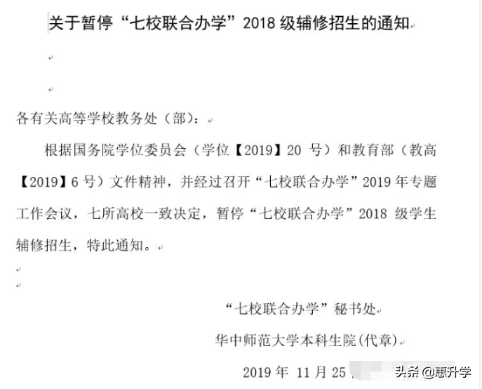华中科技大学、华中农业大学、中国地质大学教务处证实, “七校联盟”今年招生工作已停止,2016级、2017级已报名学生可继续完成剩余课程,并拿到双学位证书。