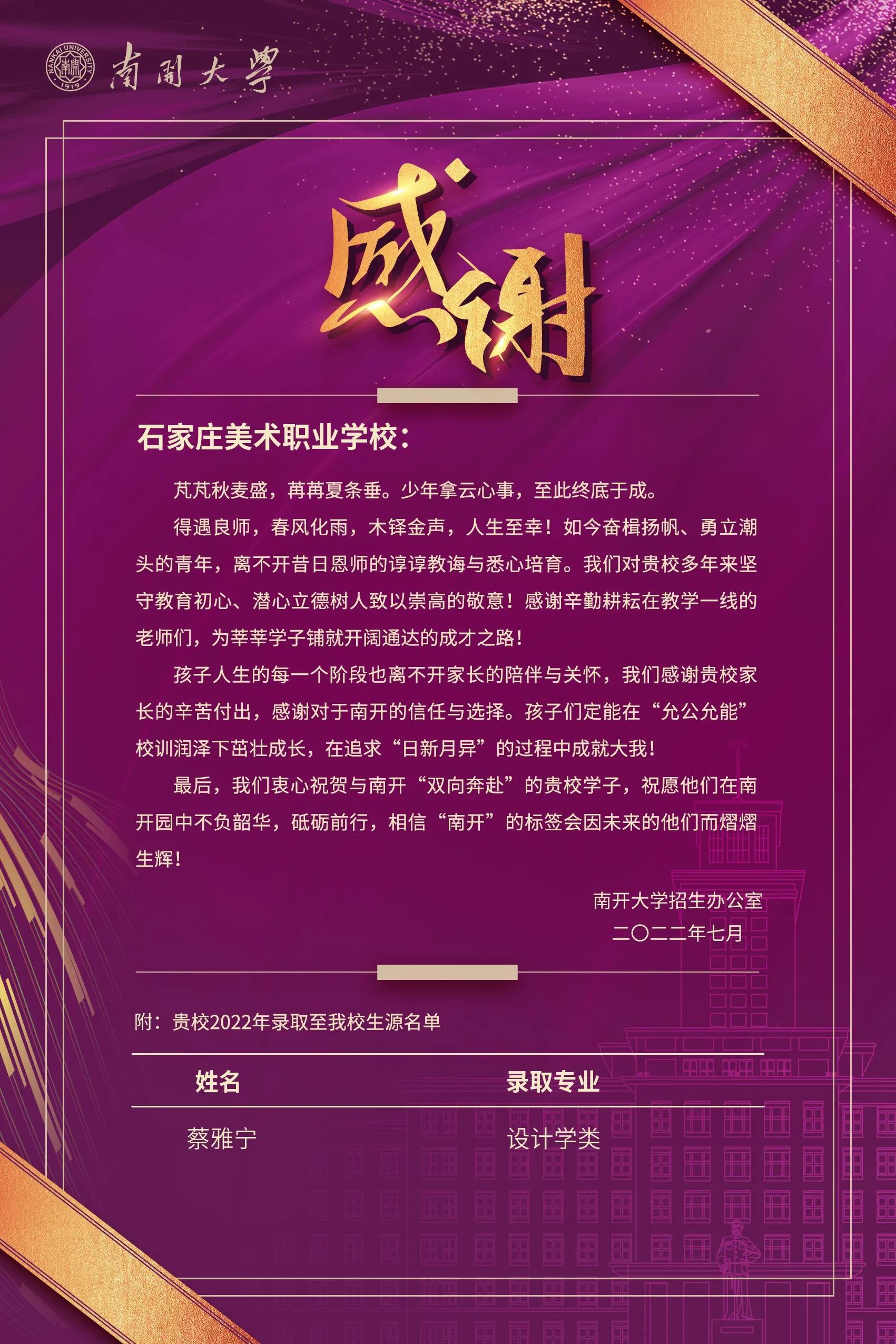 8.石家庄美术职业学院:一名考生被南开大学录取。