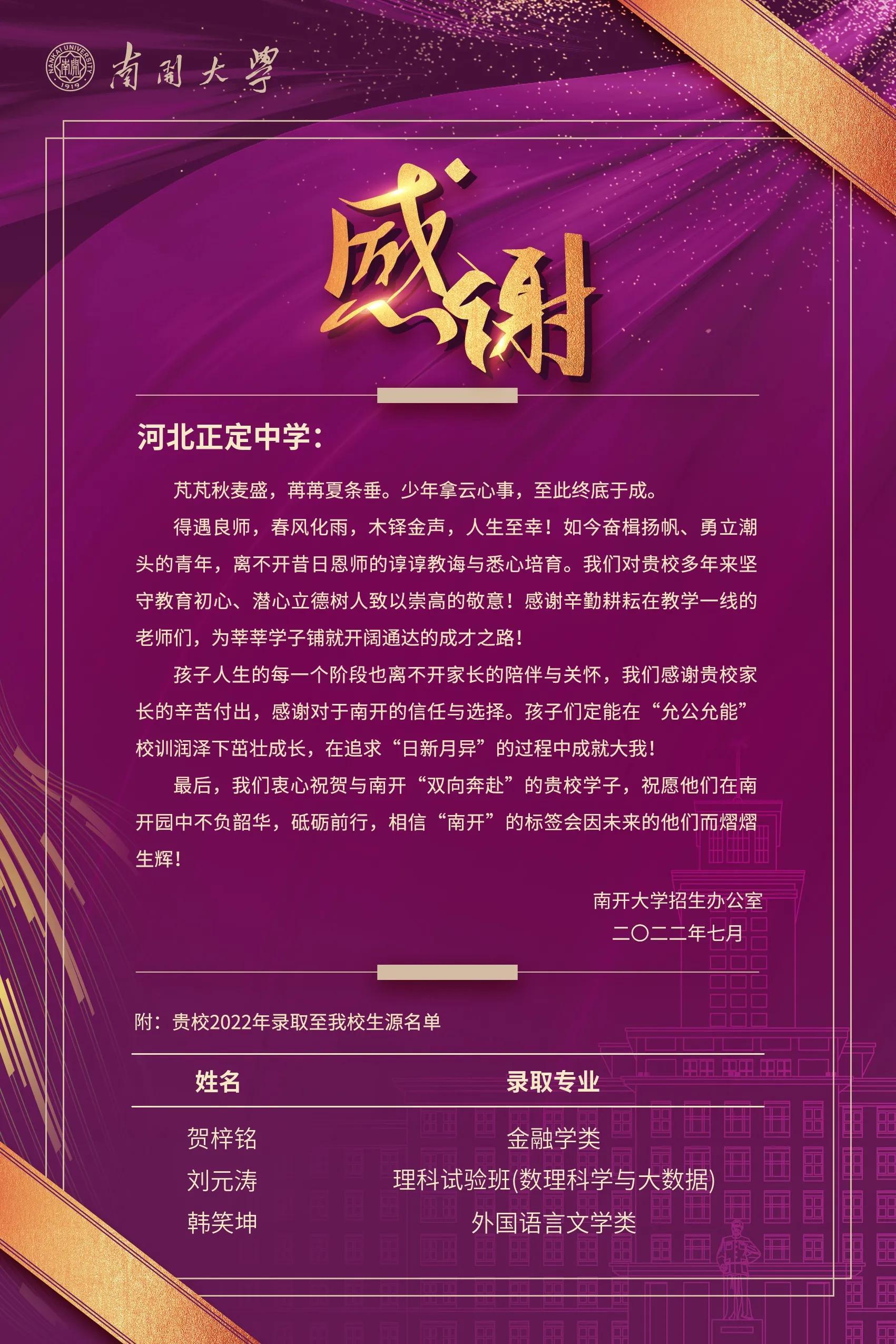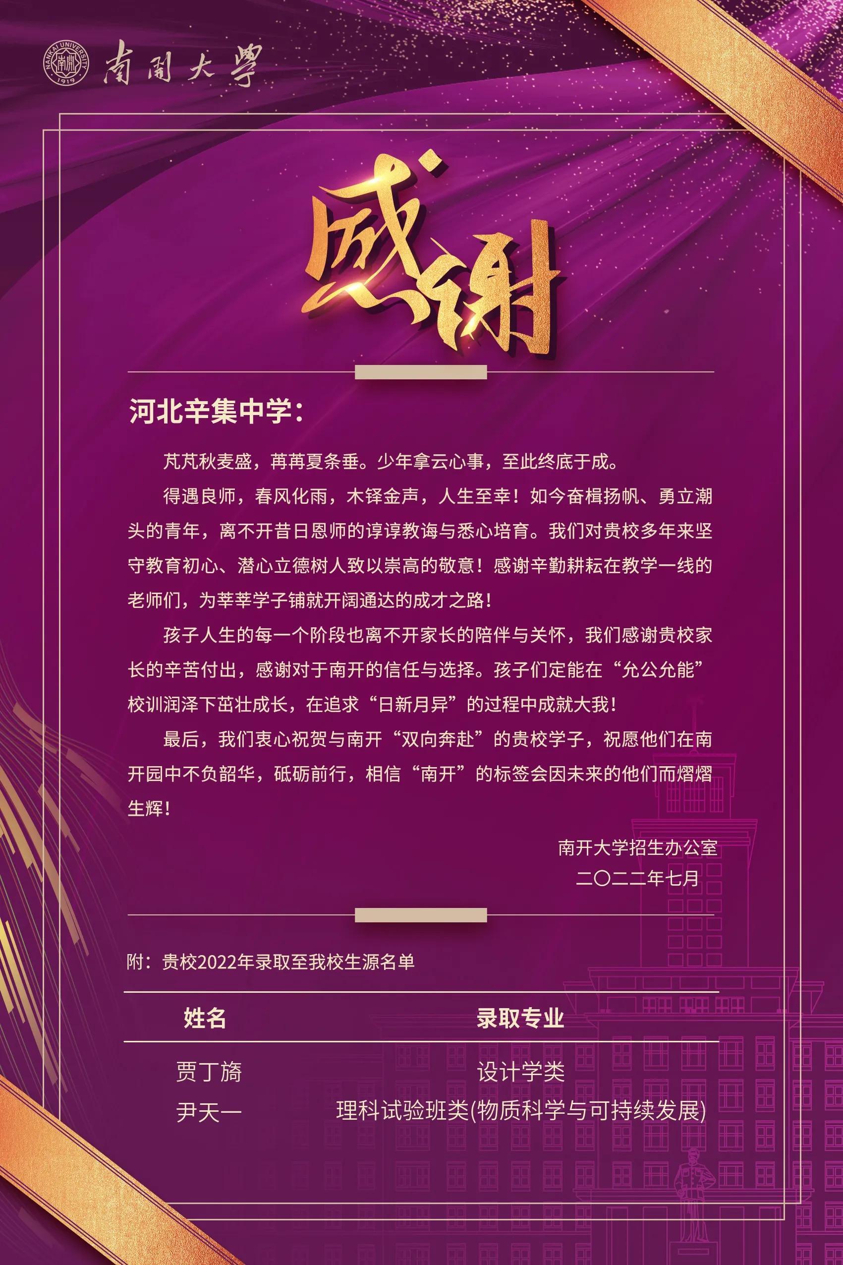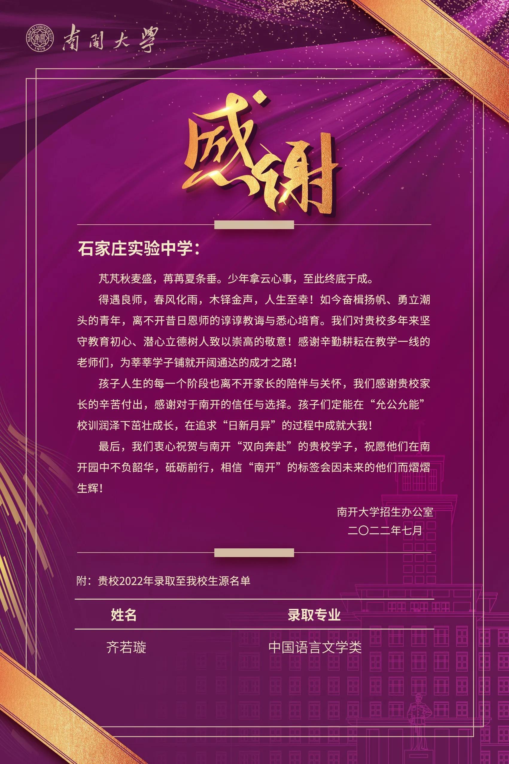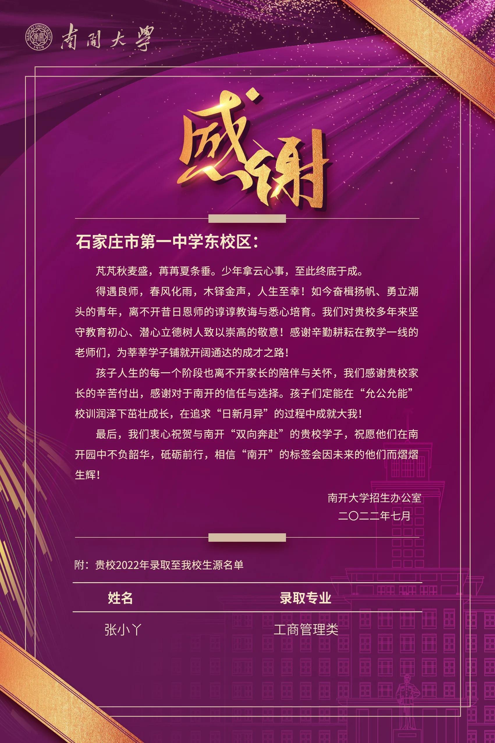 2.石家庄第一中学东校区:共有一名考生,被南开大学录取。