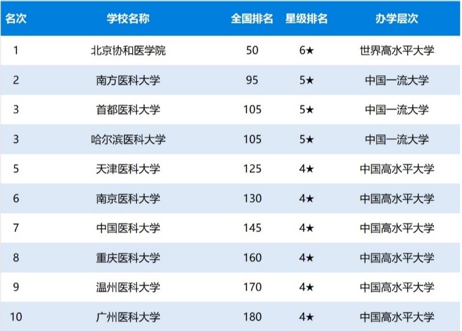 以下是2020校友会中国医科大学前十强排名情况,这个排名中医药大学没有在一起,而是单独另有排名。