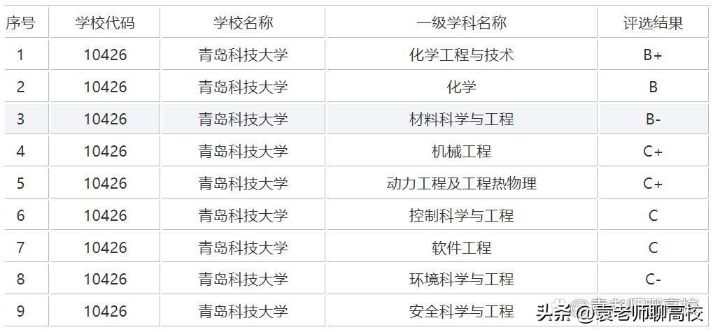 在第四轮学科评估中,青岛科技大学有9个学科上榜,其中最强的学科是化学工程与技术,被评为B+,化学被评为B,材料科学与工程被评为B-,具体可见下图。