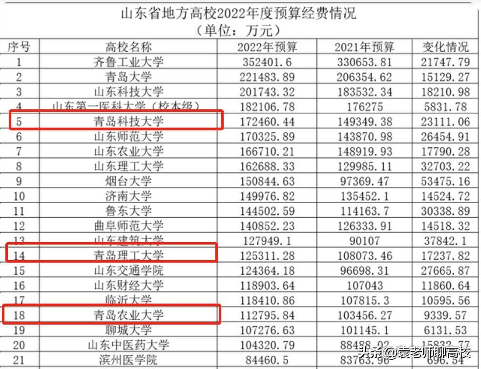 从山东省高校2022年经费预算来看,青岛科技大学经费预算达到了17亿左右,青岛理工大学的经费预算为12.5亿元,青岛农业大学的经费预算为11.2亿元。