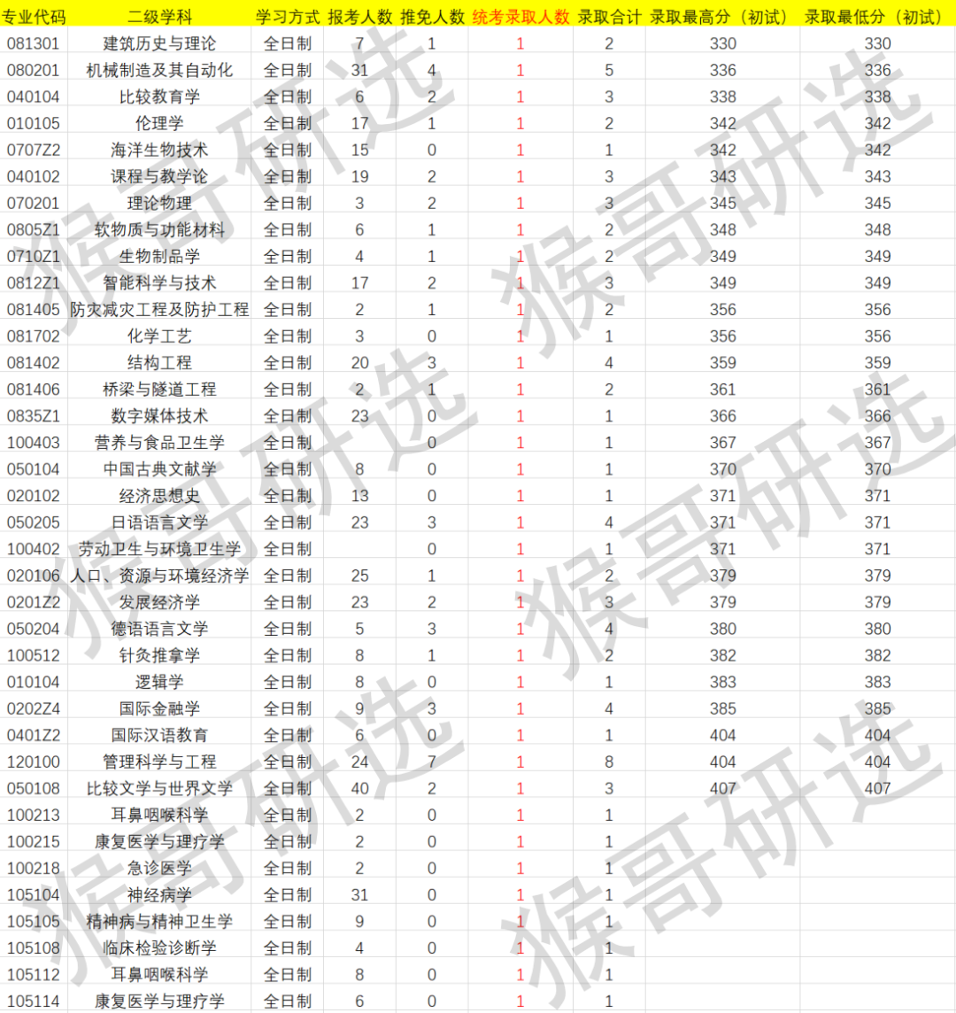 反观录取合计人数偏低的专业,全日制的建筑历史与理论、机械制造及其自动化、比较教育学、伦理学、海洋生物技术等专业的统考录取人数为1人,整体录取人数偏少。值得注意的是,全日制的音乐、国际贸易学、国际政治、台湾研究、教育经济与管理等专业统考录取人数为0,后续可能存在缩招或不招的风险,属于避坑专业。