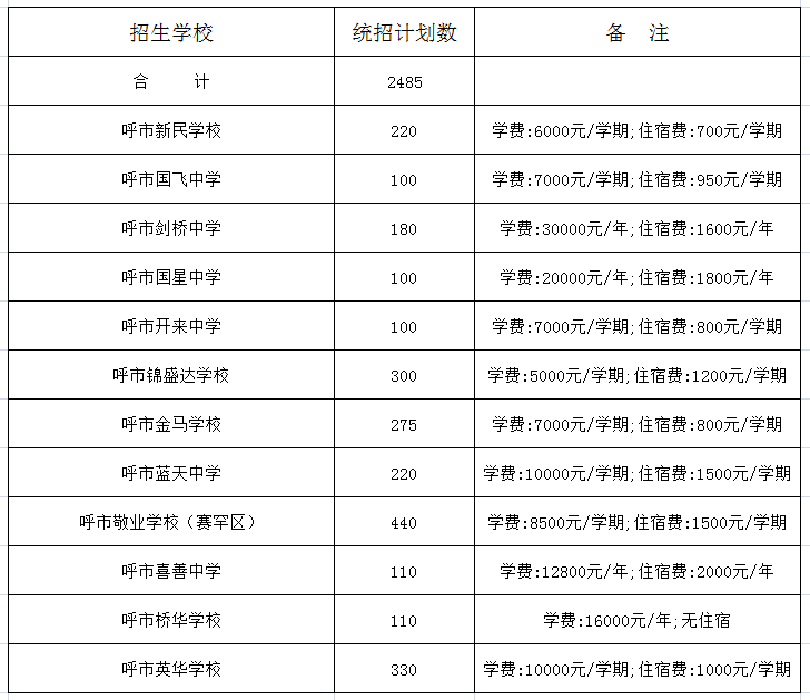 呼市英华学校,学费1万元/学期,住宿费1000元/学期。