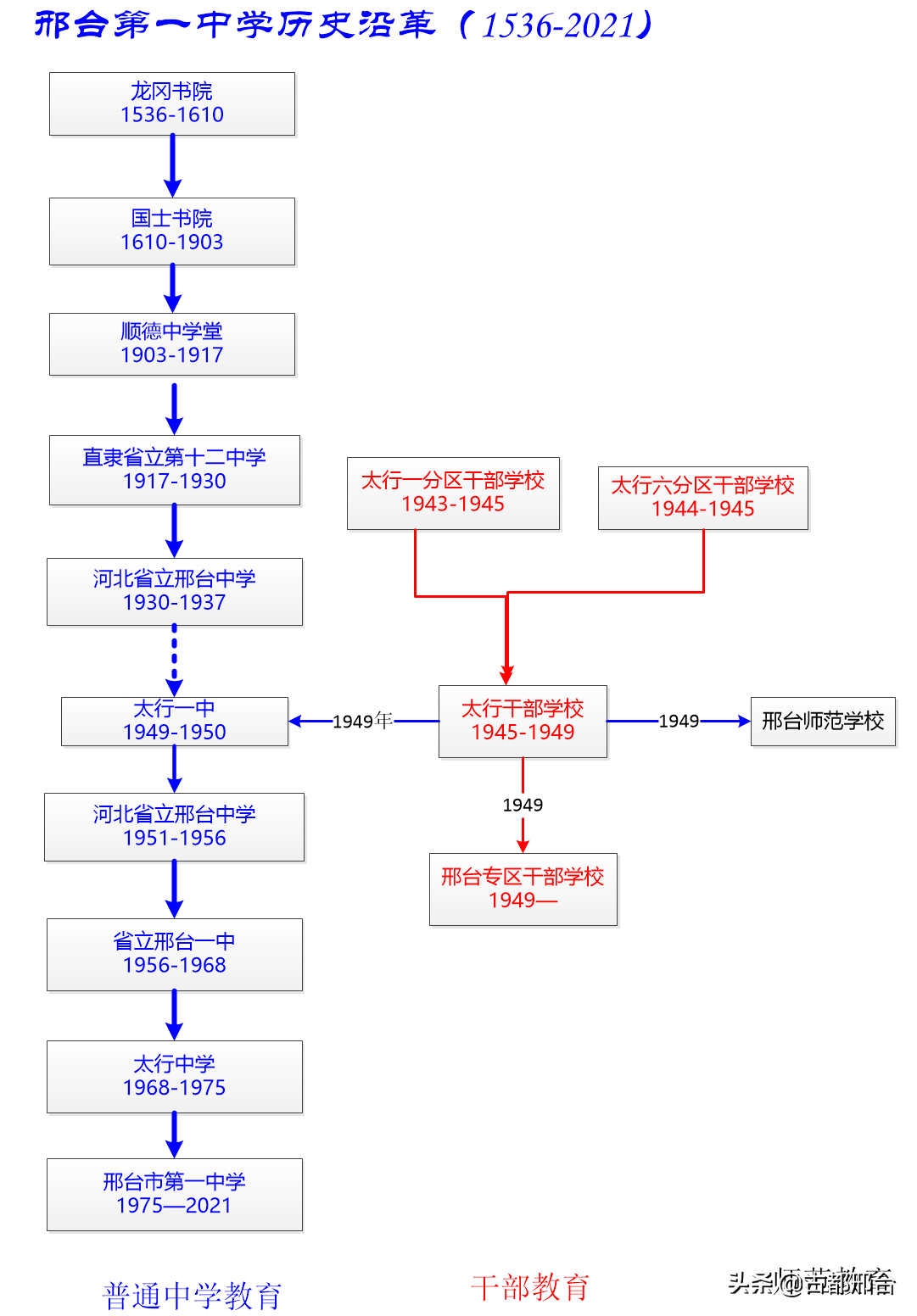 【太行干部学校,又称太行联中干部学校,1945年10月,太行一分区干部学校(晋冀抗日中学)和涉县的太行六分区干部学校迁入邢台,其中一部分并入邢台师范学校中学班,一部分干部学员组建为太行干部学校(又称太行联中干部学校),这是一所培养革命干部的学校。1946年6月太行干部学校迁至临城县北关。1948年7月,太行干部学校迁回邢台市。1949年太行干部学校一分为二,一部分改建为普通中学,即太行第一中学(当时邢台为太行第一专区),一部分改建为专区干部学校】