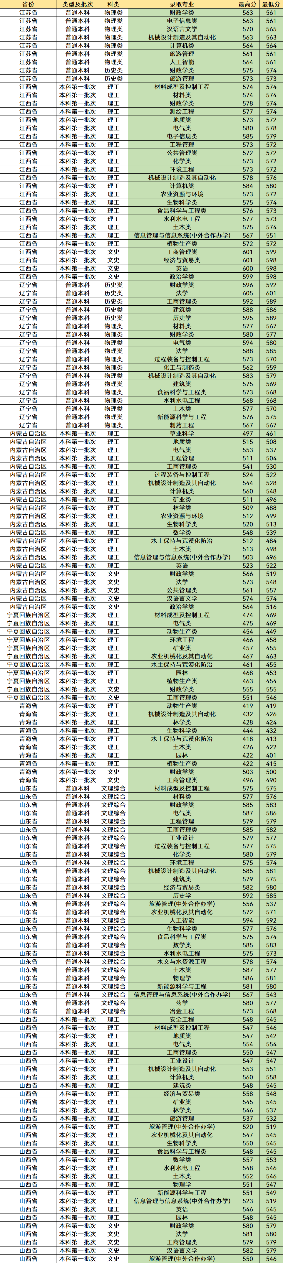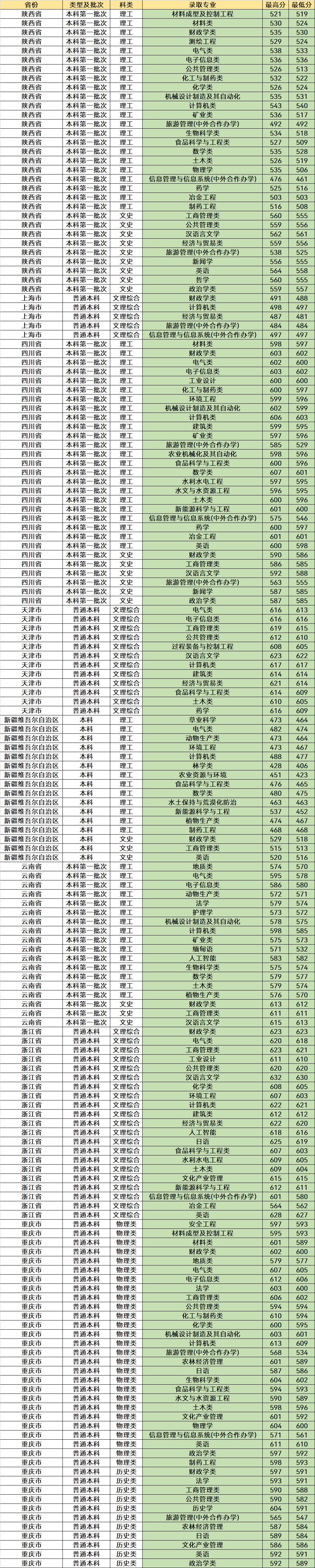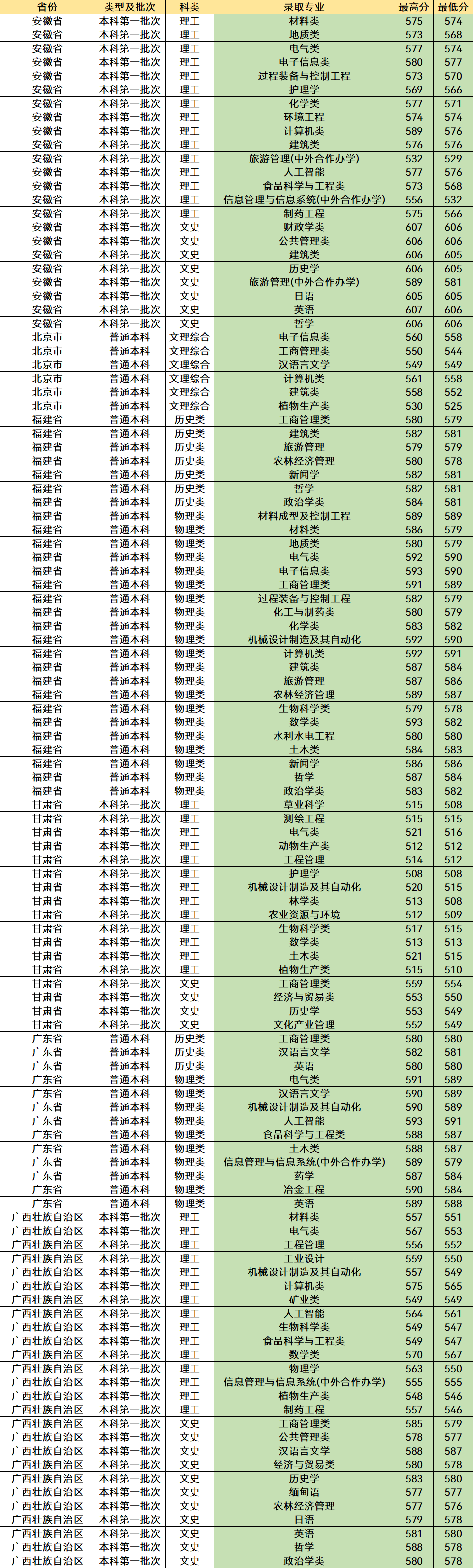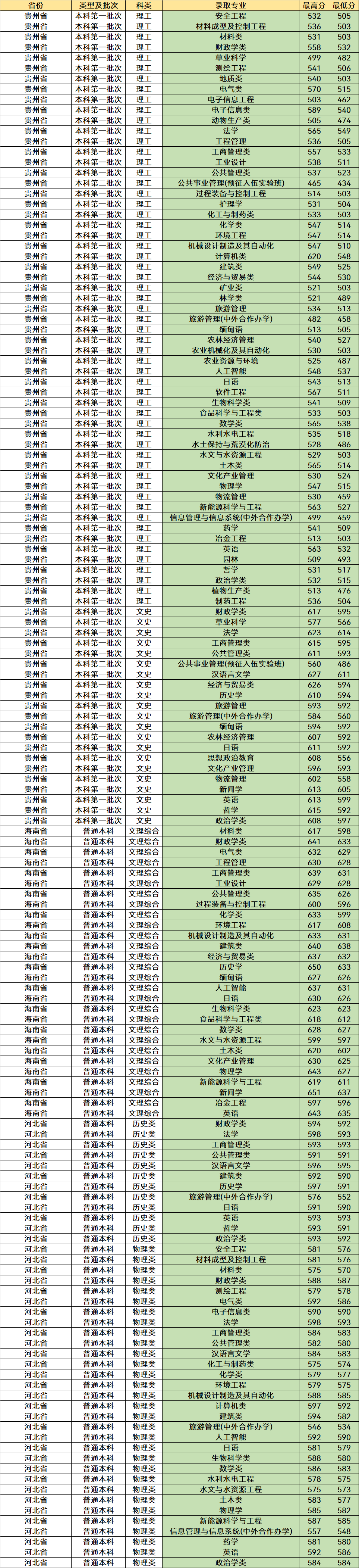 上面是贵州大学官网上的各省各专业本科批次录取的分数线,可以看到大多数省份的录取分数都是在五百多分的样子,对应各自省份的录取批次线来看,大多数之超出一本线几十分,相对比其他211大学动不动就是超出一本线一百多分的情况来说,贵州大学算是比较好考的了。