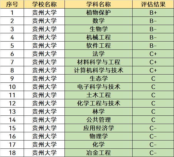 贵州大学的植物保护一级学科被评为B+,数学、生物学、机械工程、软件工程4门一级学科被评为B-。