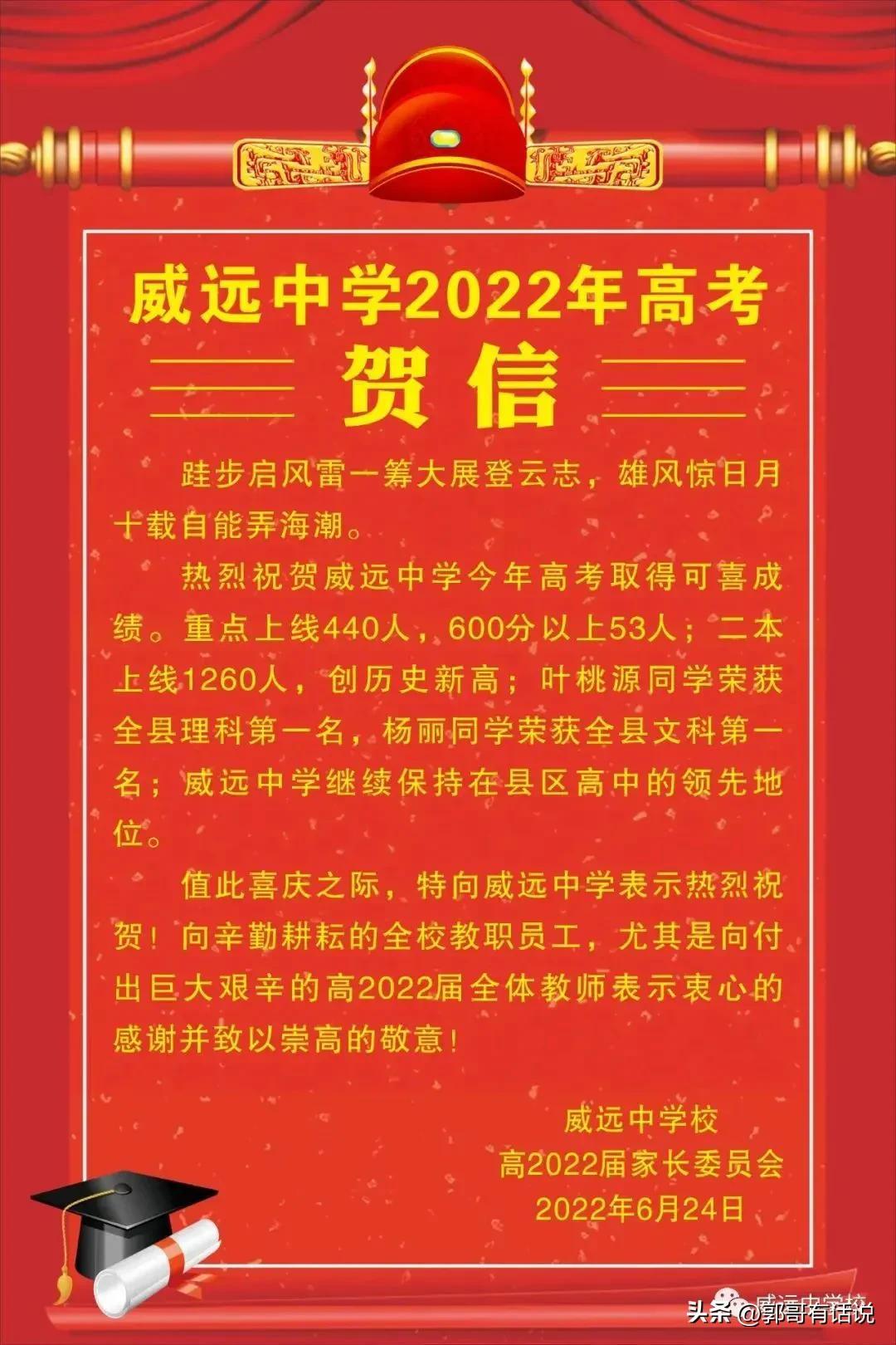 2022年高考威远中学一本上线440人,本科上线1260人,文理县第一名均在这所学校!
