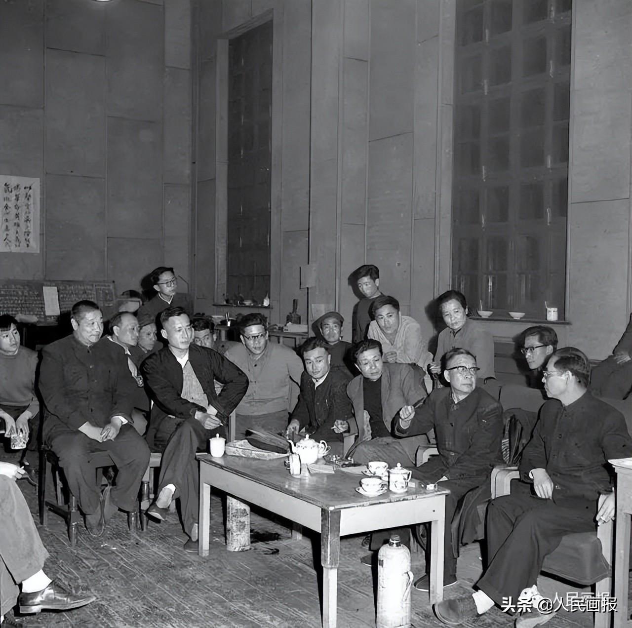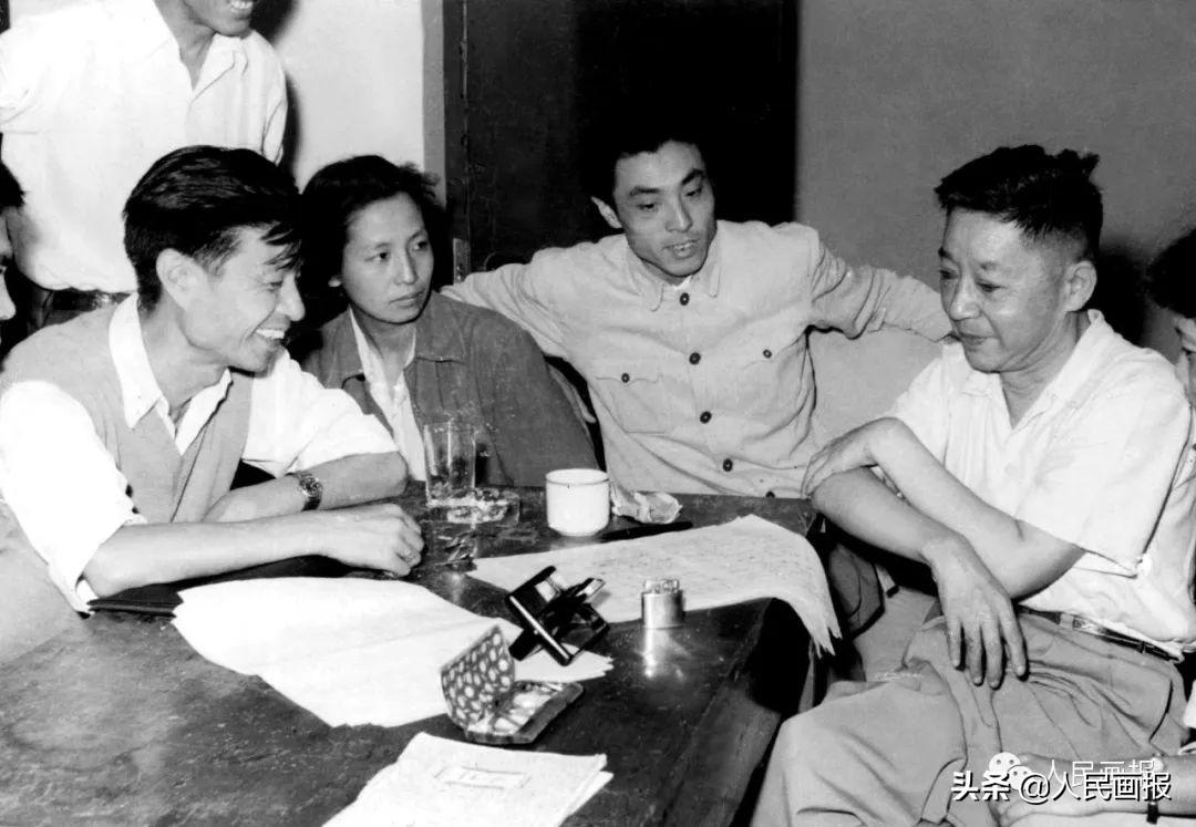 1956年,老舍(右二)和北京人艺导演焦菊隐(右一)、夏淳(右三)等人一起讨论《茶馆》剧情。本刊资料
