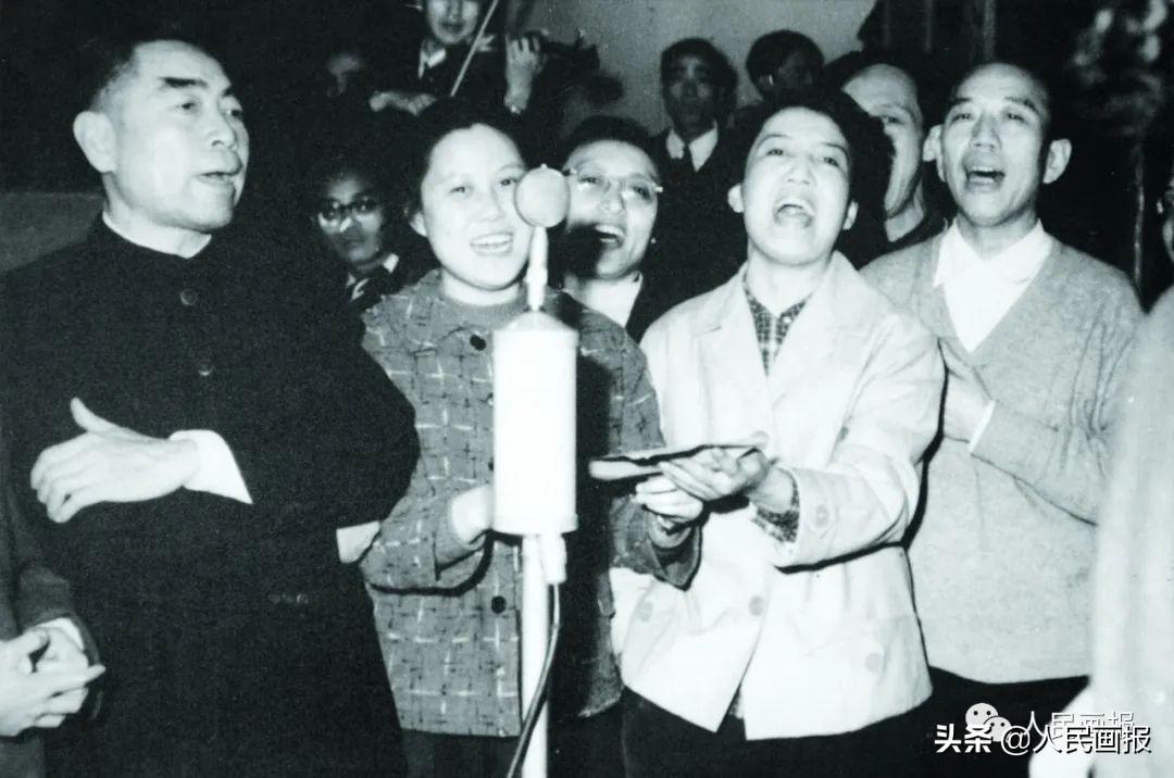 1962年,在北京人艺的春节晚会上,朱琳(右二)和周恩来总理(左一)、王震(右一)等一起演唱《南泥湾》。本刊资料