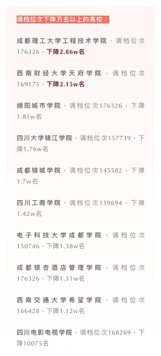 与2020年相比,省内高校本科二批次在川调档线及位次整体下降,尤其是(原)独立学院,如西南财经大学天府学院、绵阳城市学院(原西南科技大学城市学院)、四川大学锦江学院、成都锦城学院(原四川大学锦城学院)等,多数下降万名以上,最多下降达2.86w名,为成都理工大学工程技术学院。