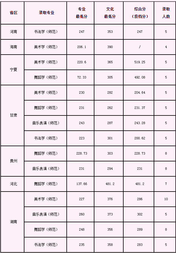 艺术类专业面向河南、海南、宁夏等7省招生,招生专业独居动物书法(师范)、美术学(师范)、音乐学(师范)、音乐表演(师范)、舞蹈学(师范)等专业。