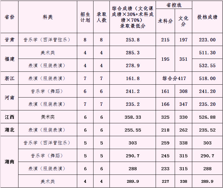 艺术类专业面向广东、甘肃、福建、浙江、河南、江西、湖北、湖南等8省招生,招生的专业包括音乐学、音乐表演、美术学、视觉传达设计、环境设计、产品设计、服装与服饰设计 (表演)等专业。
