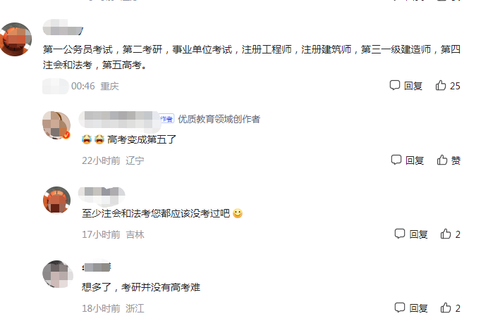 网友将公考放在了首位,考研排在了第2名,事业单位考试第3名,其次依次是注册工程师、注册建筑师、一级建筑师、注册会计师和司法考试,而高考则被排在了最后一名。