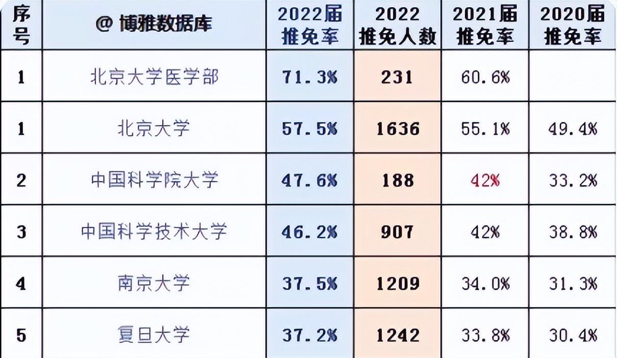 北大医学部2022届的推免率高达71.3%,表示有7成以上的大学生都是通过保研进入的,北大2022届推免率是57.5%,也是很高的,国科大的2022届推免率是47.6%,同样偏高。