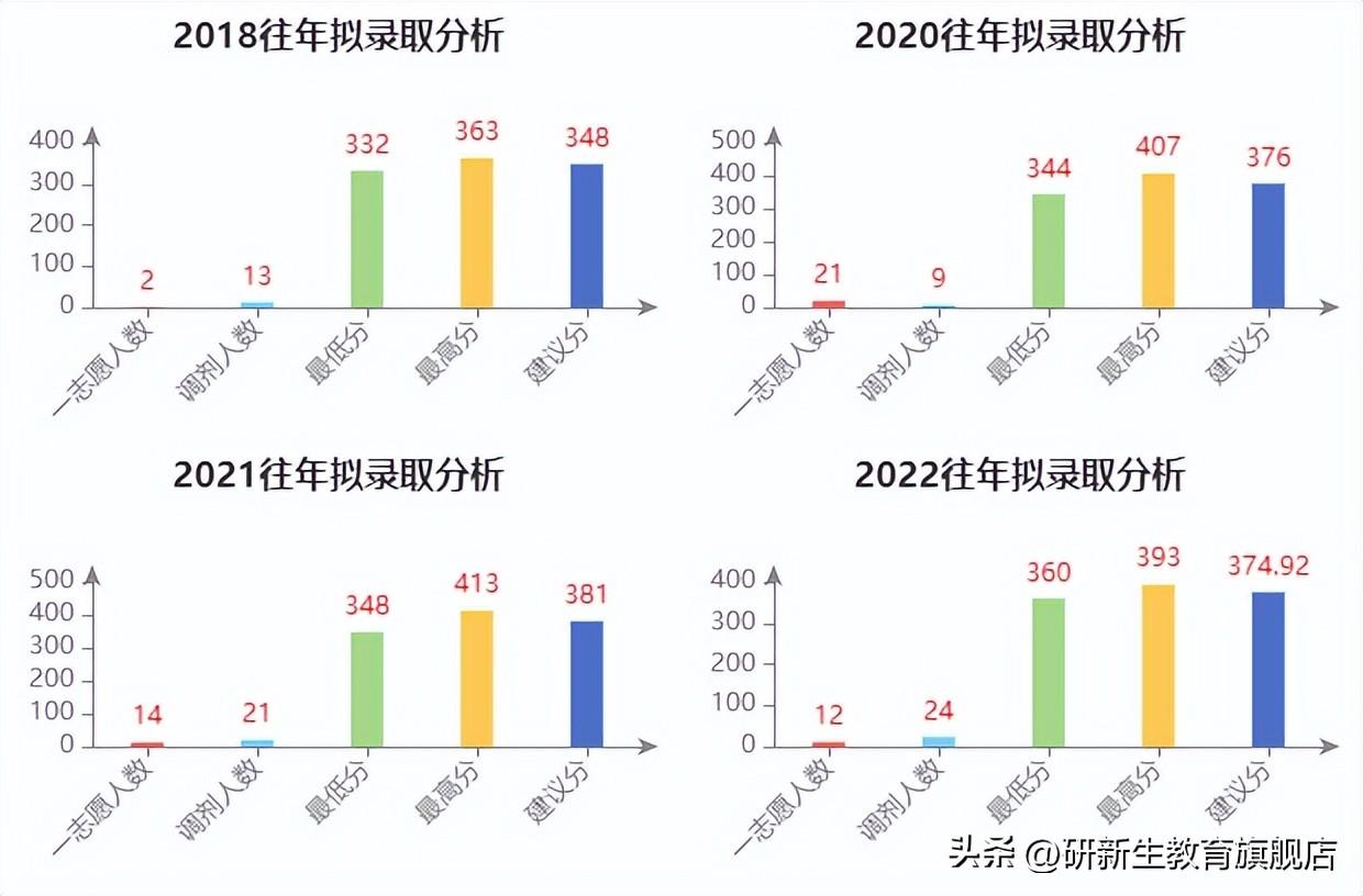 从录取分数来看,录取人数最多的集中在353-374分这个分数段,因此,想要稳妥上岸,建议初试分数定在370+。