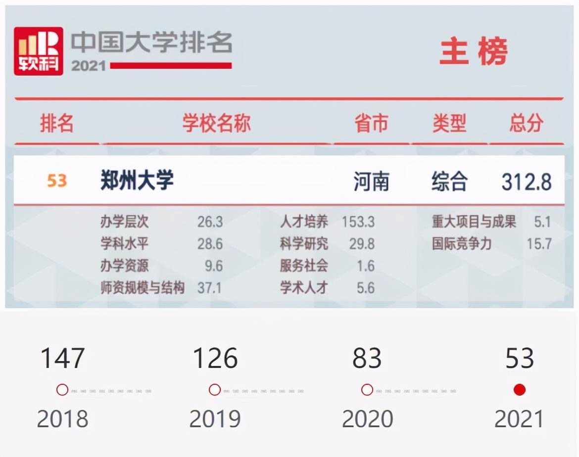 近年来,在教育部、河南省委省政府和全省亿万人民的大力支持下,郑州大学办学质量与水平、创新与服务能力显著提升。2021年4月,软科和武书连先后发布了最新的中国大学排名,在“武书连2021中国大学排行榜”中,郑州大学位列全国第33位,分省排名位居河南第一;在“2021软科中国大学排名”中,郑州大学位列主榜第53位,实现了排名的“四连升”,在4年间上升了94个位次,与2020年相比上升了30位。
