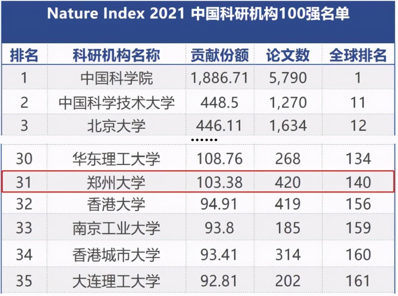 根据全球顶级科研期刊《自然》(Nature)发布的增刊“2021中国自然指数”来看,郑州大学位列中国100强科研机构名单第31位,全球排名第140位。在《自然》同期发布的2021中国化学机构50强名单中,郑州大学位列全国第23位。