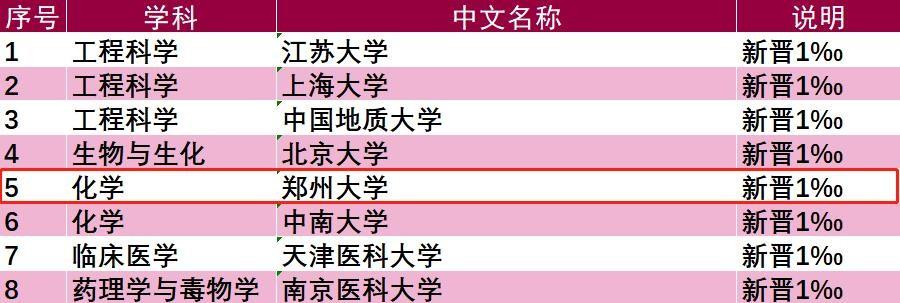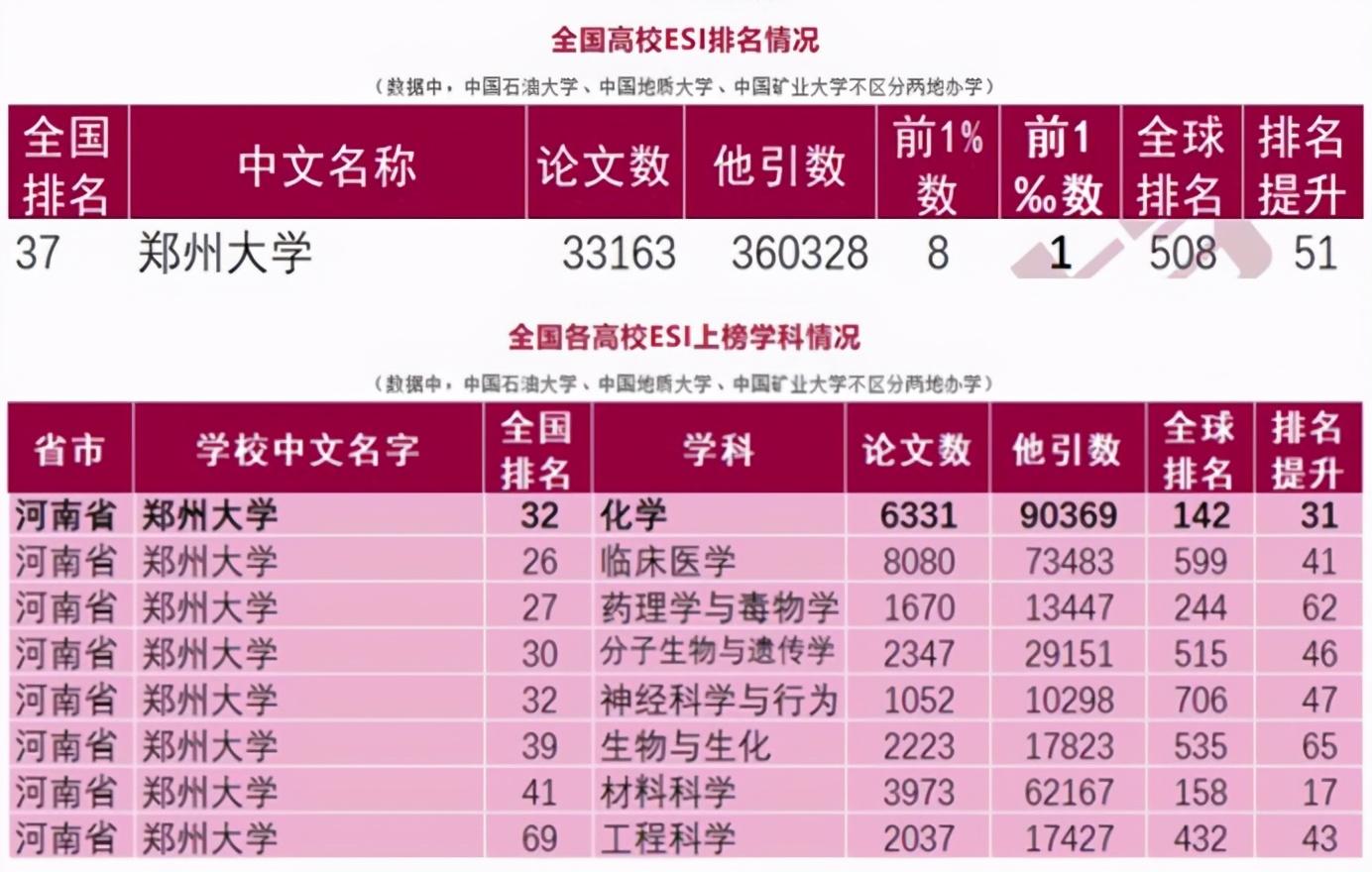 2021年5月,全球领先的专业信息服务提供商科睿唯安公布了最新ESI排名,郑州大学实现重大突破,化学学科首次进入全球前1‰,成为河南省首个进入前1‰学科,另有7个学科进入全球前1%,整体排名位居国内高校第37位,全球排名508位,提升51位,取得了显著进步。