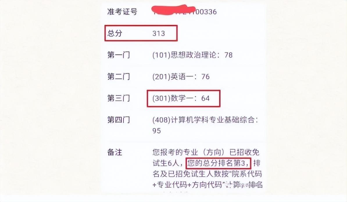 预计统招40名考生,也是没有招满,复试线是310分,有一位考研考生是以313分进入复试的,数学只考了64分,就以这一分数考生还排在第3名。