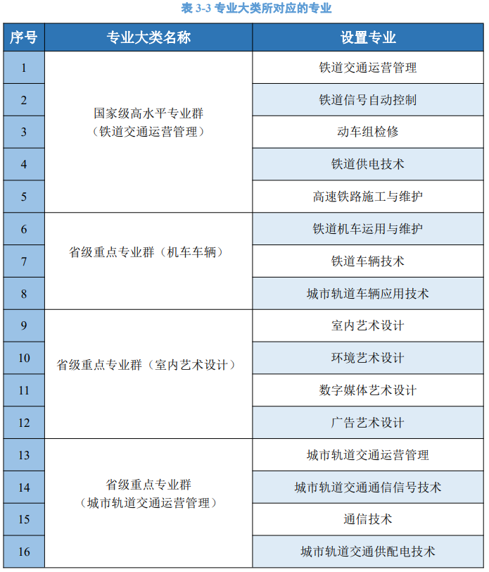 现开办专业36个,专业以轨道交通专业为优势和特色,其中国家“双高”建设专业群1个(铁道交通运营管理专业群),会计、艺术设计等地方专业省内一流。