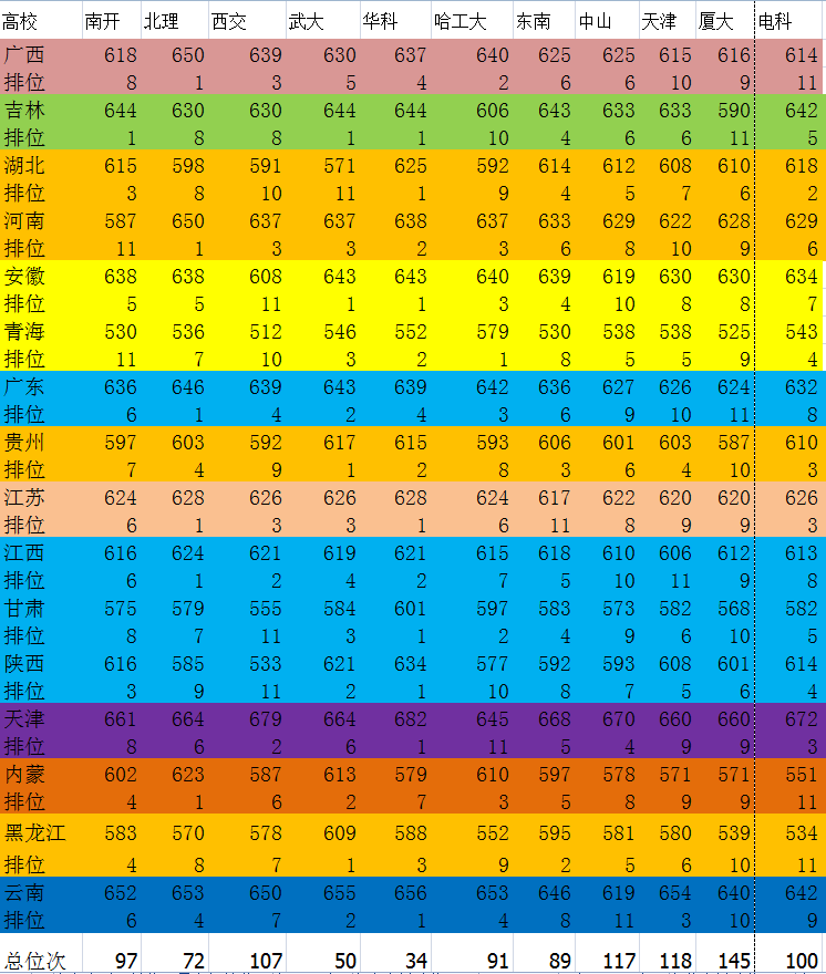 而西安交通大学在这15个省市中的表现则是乏善可陈,从原来的11校顶尖滑落到中下水平;东南大学进步比较大,从去年的中下水平上升到中上,也是得益于学校在各个地方的稳定发挥。