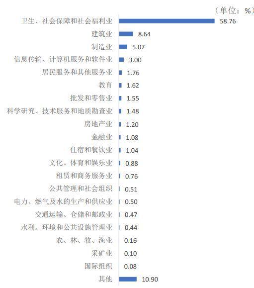 卫生、社会保障和社会福利业是流向最多的行业,占总数的 58.76%;另外,建筑业、制造业也是流向较多的行业,比例都在 5%以上。
